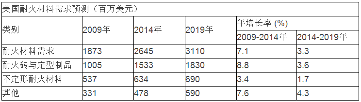 2015年6月最新一份預測報告顯示,美國對耐火材料的需求將以每年3.3%的速度增長,到2019年達到31億美元。隨著鋼鐵生產的放緩,2014-2019年間耐火材料的收益將會比2009-2014年間有所降低。耐火材料的銷量也將因整體產量的縮減而集中在一些使用壽命較長的耐火材料上。此外,市場對使用效果更好的耐火材料需求的增加,使其在價格攀升的同時提升了整體銷售額,也由于更換周期變長而令市場對耐火材料的總需求量有所減少。耐火原料價格的增長也會使耐火制品增值。此外,非金屬礦產行業有望成為增長最快的市場,采用一些高成本的耐火原料,也將促使耐火材料整體市場價值的增長。
