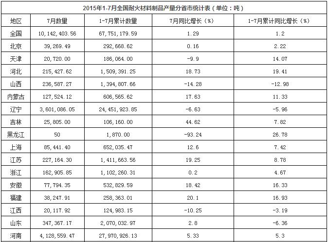 2015年1-7月全國耐火材料制品產(chǎn)量各省市統(tǒng)計