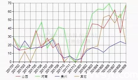 9月份,山西棕剛玉生產商庫存率為67.14%,環比增長96.26%;河南棕剛玉生產商庫存率為68.17%,環比增加29.33%;貴州棕剛玉生產商庫存率為21.61%,環比跌幅11%;其它地區棕剛玉生產商庫存率為21.05%,較8月份下降63.16%。