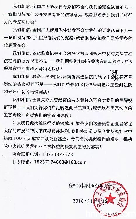 該文章中還有一張發表于2018年11月19日,蓋有“登封市棕剛玉企業協會”公章的公開聲明。