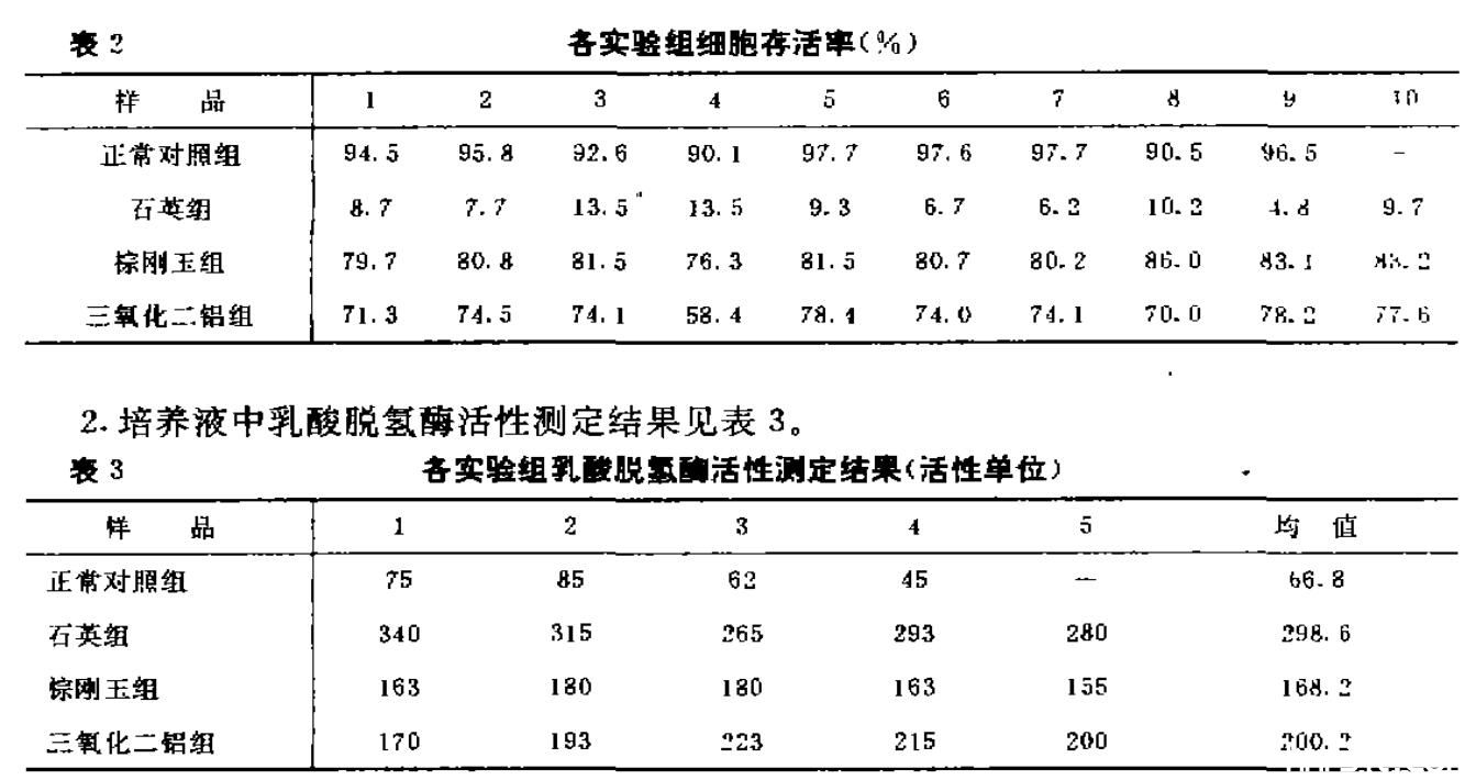 選健康豚鼠,取肺泡巨噬細胞進行培養.然后分別加入生理鹽水(作正常對照)及石英、棕剛玉、三氧化二鋁各種粉塵懸液,使粉塵在培養液中的濃度為118.ug/ml。繼續培養16小時后觀察細胞存活率及培養液中乳酸脫氫酶的含量。其結果如一下: