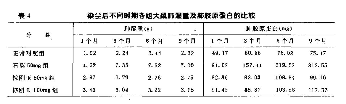 肺濕重,肺膠原蛋白含量均以石英組最高,棕剛玉組介于石英和對照組之間。在一個月時,肺膠原含量經統計學處理,棕剛玉50mg組與對照組比較,均有高度顯著性差異((P<0.01),與石英組無差異。至九個月時棕剛玉10Omg組肺膠原含量和石英組比較育高度顯著性差異(P<0.01),與對照組有顯著性差異(P<0.05)。