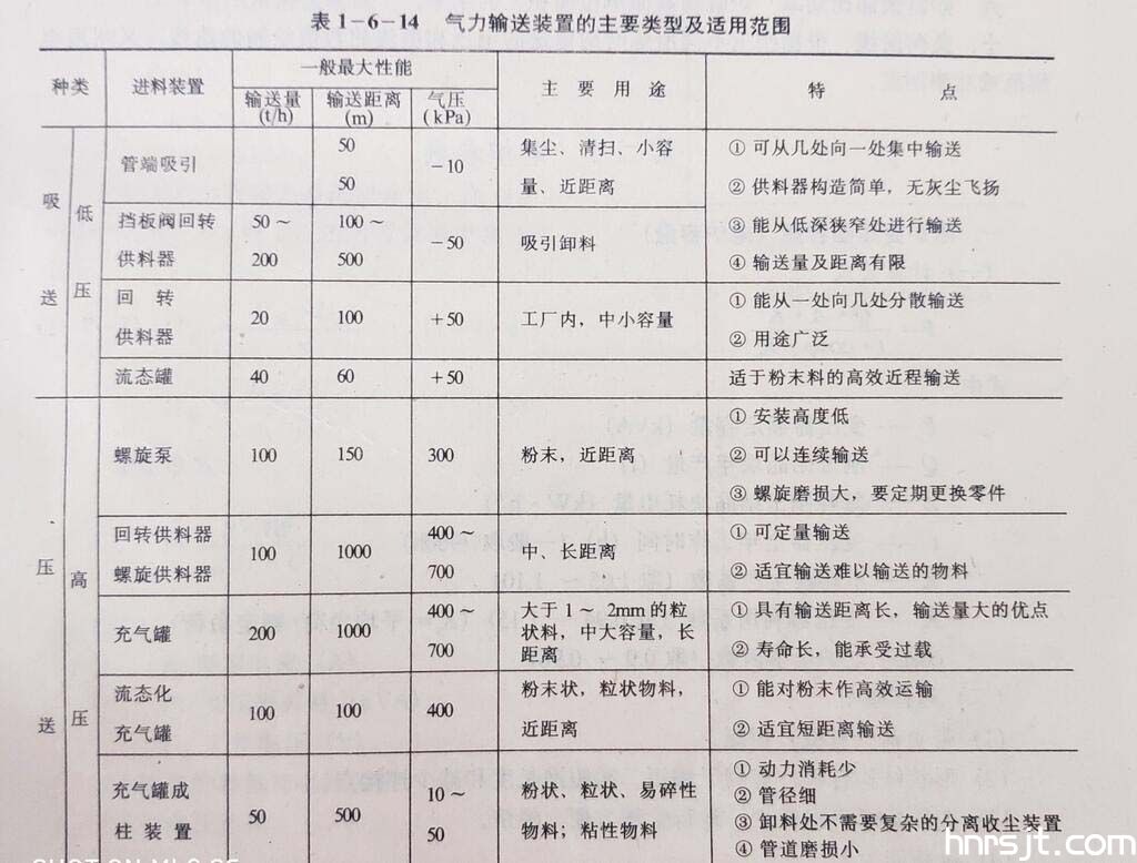 氣力輸送的優點是:①機體尺寸小,管道敷設靈活;②輸送效率高,勞動強度低,粉塵飛揚少;③設備簡單,易于制造與安裝;④操作簡便,易于實現控制自動化。表1—6—14為氣力輸送裝置的主要類型及適用范圍。