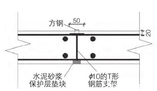 T形鋼筋支架采用鋼筋, 縱向間距2 m, 上口高程測量后, 與平臺底部鋼筋電焊固定, 底部設(shè)置保護(hù)墊層, 防止鋼筋支架下沉 (圖1) 。