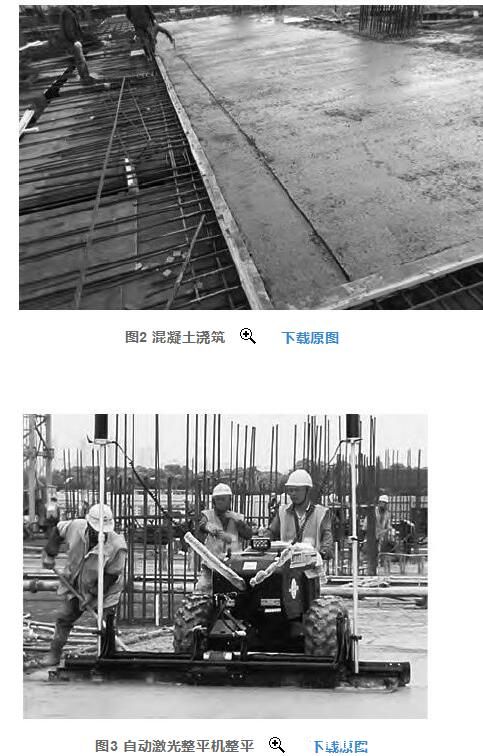混凝土樓板人工攤鋪平整, 振搗密實后, 采用自動激光整平機(jī)整平 (圖3) 。