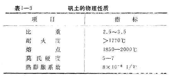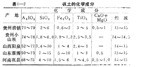 我國(guó)礬土蘊(yùn)藏量極為豐富,大型的新礦不斷有發(fā)現(xiàn),山西陽(yáng)泉、河南鞏縣,貴州清鎮(zhèn)等地都是有名的礬土產(chǎn)地,而且品位都很高。幾個(gè)地區(qū)的礬二卜化學(xué)成分如表1—2,物理性能如表1—3。