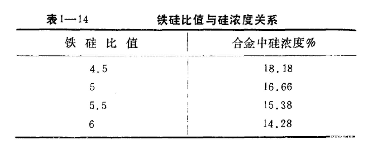 不同鐵硅比與相應的合金中硅濃度關系見表1一14