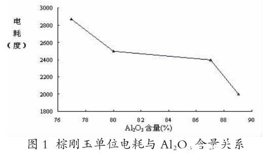 我國(guó)的棕剛玉生產(chǎn)起初都是用固定爐進(jìn)行生產(chǎn)的,上世紀(jì)七十年代出現(xiàn)了傾倒?fàn)t生產(chǎn)工藝,目前我國(guó)棕剛玉生產(chǎn)使用固定爐和傾倒?fàn)t的比例大約為3:4。不論是固定爐也好或是傾倒?fàn)t生產(chǎn)也罷,其生產(chǎn)工藝基本相似,都是以鋁礬土為主要原材料,再配以其它輔助材料在礦熱爐中經(jīng)高溫熔化,經(jīng)一系列的物理化學(xué)反應(yīng)而制得的,是一種能耗比較高的產(chǎn)品,其能耗費(fèi)用在生產(chǎn)成本中約占1/2-2/3。因此鋁礬土品質(zhì)的好壞決定了能耗的高低。上世紀(jì)八十年代之前,生產(chǎn)棕剛玉所用的鋁礬土其Al203含量均為80%左右,鋁硅比為20:1,用這種高品位鋁礬土生產(chǎn)棕剛玉時(shí),固定爐的單位耗電為2600KW H左右,傾倒?fàn)t單位耗電為2500K W H左右。鋁礬土中的Al203含量與單位耗電的關(guān)系如圖1